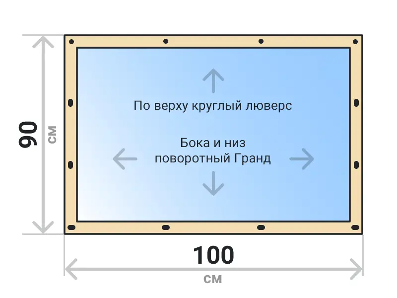 Мягкое окно съемное из прозрачной ПВХ пленки 700 микрон на поворотных скобах Гранд Лок по бокам и низу. По верхнему краю круглый люверс. Расстояние между креплениями 30-40 см. Полностью готовый к установке комплект, включая саморезы и ремни для скрутки.