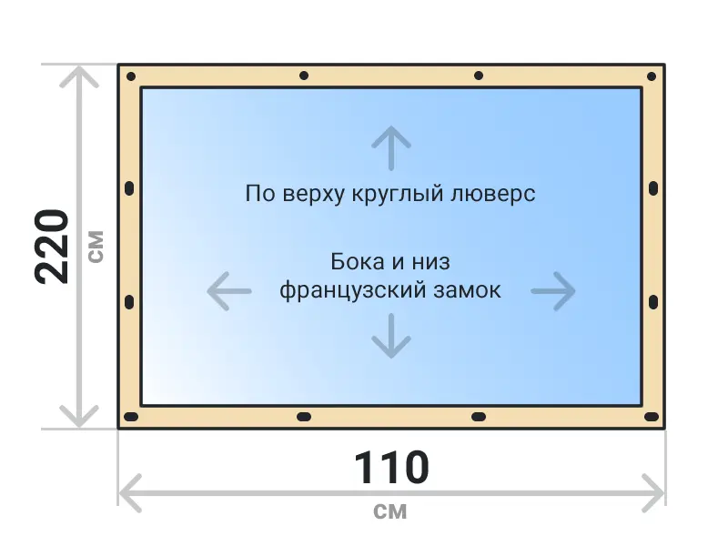 Мягкое окно съемное из прозрачной ПВХ пленки 700 микрон на французских замках по бокам и низу. По верхнему краю круглый люверс. Расстояние между креплениями 30-40 см. Полностью готовый к установке комплект, включая саморезы и ремни для скрутки.