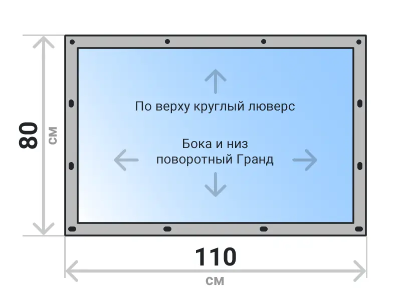 Мягкое окно съемное из прозрачной ПВХ пленки 700 микрон на поворотных скобах Гранд Лок по бокам и низу. По верхнему краю круглый люверс. Расстояние между креплениями 30-40 см. Полностью готовый к установке комплект, включая саморезы и ремни для скрутки.