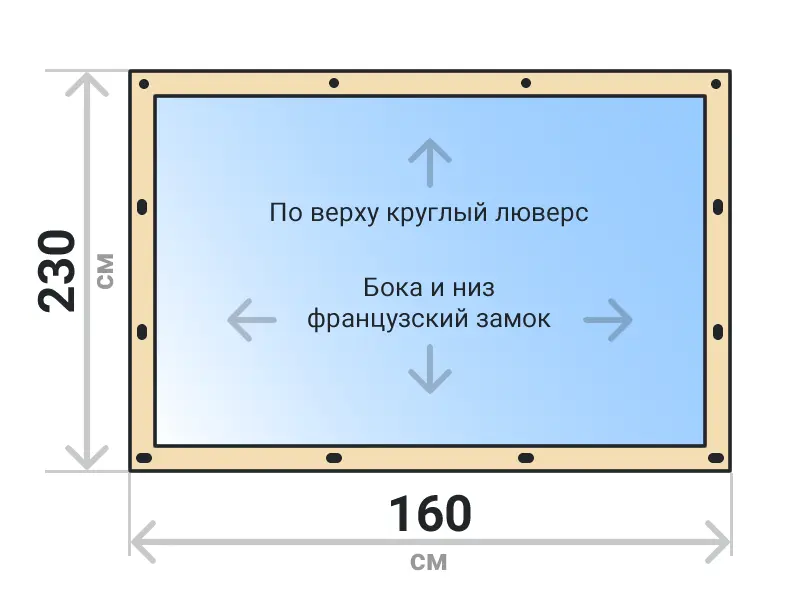 Мягкое окно съемное из прозрачной ПВХ пленки 700 микрон на французских замках по бокам и низу. По верхнему краю круглый люверс. Расстояние между креплениями 30-40 см. Полностью готовый к установке комплект, включая саморезы и ремни для скрутки.