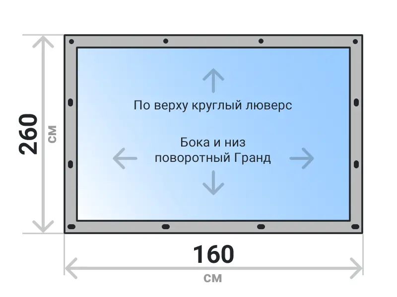 Мягкое окно съемное из прозрачной ПВХ пленки 700 микрон на поворотных скобах Гранд Лок по бокам и низу. По верхнему краю круглый люверс. Расстояние между креплениями 30-40 см. Полностью готовый к установке комплект, включая саморезы и ремни для скрутки.