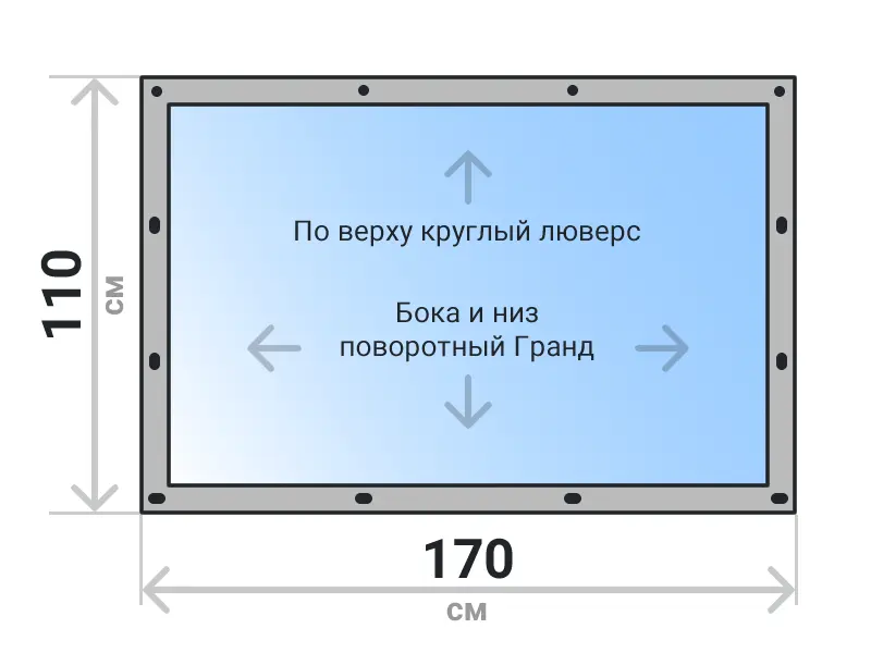 Мягкое окно съемное из прозрачной ПВХ пленки 700 микрон на поворотных скобах Гранд Лок по бокам и низу. По верхнему краю круглый люверс. Расстояние между креплениями 30-40 см. Полностью готовый к установке комплект, включая саморезы и ремни для скрутки.