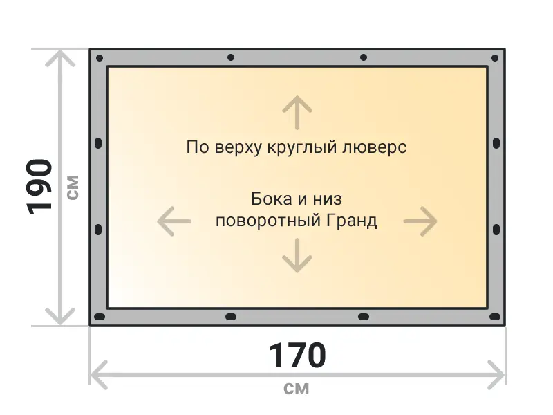 Мягкое окно съемное из прозрачной ТПУ пленки 500 микрон на поворотных скобах Гранд Лок по бокам и низу. По верхнему краю круглый люверс. Расстояние между креплениями 30-40 см. Полностью готовый к установке комплект, включая саморезы и ремни для скрутки.
