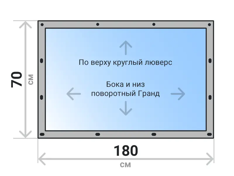 Мягкое окно съемное из прозрачной ПВХ пленки 700 микрон на поворотных скобах Гранд Лок по бокам и низу. По верхнему краю круглый люверс. Расстояние между креплениями 30-40 см. Полностью готовый к установке комплект, включая саморезы и ремни для скрутки.