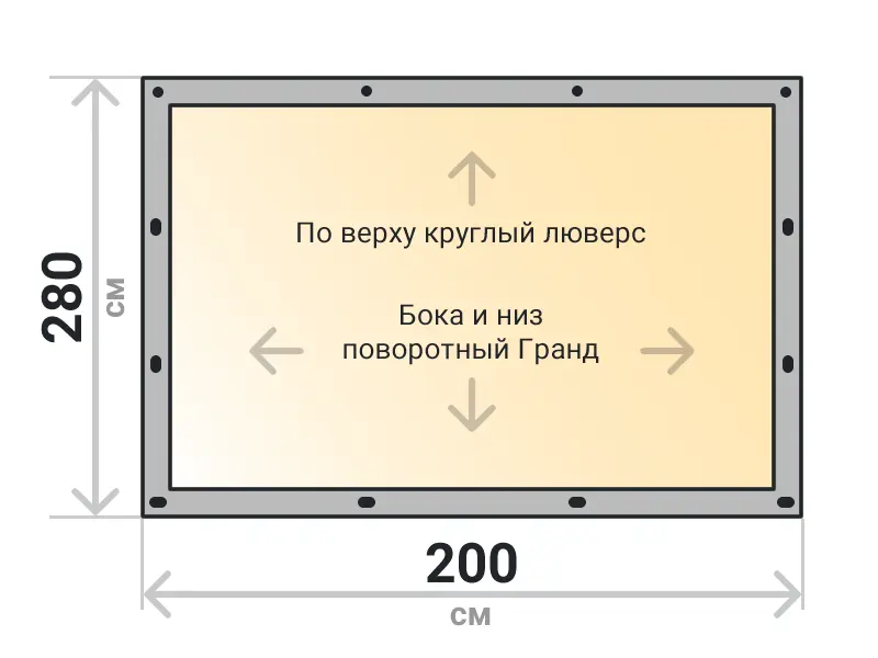 Мягкое окно съемное из прозрачной ТПУ пленки 500 микрон на поворотных скобах Гранд Лок по бокам и низу. По верхнему краю круглый люверс. Расстояние между креплениями 30-40 см. Полностью готовый к установке комплект, включая саморезы и ремни для скрутки.