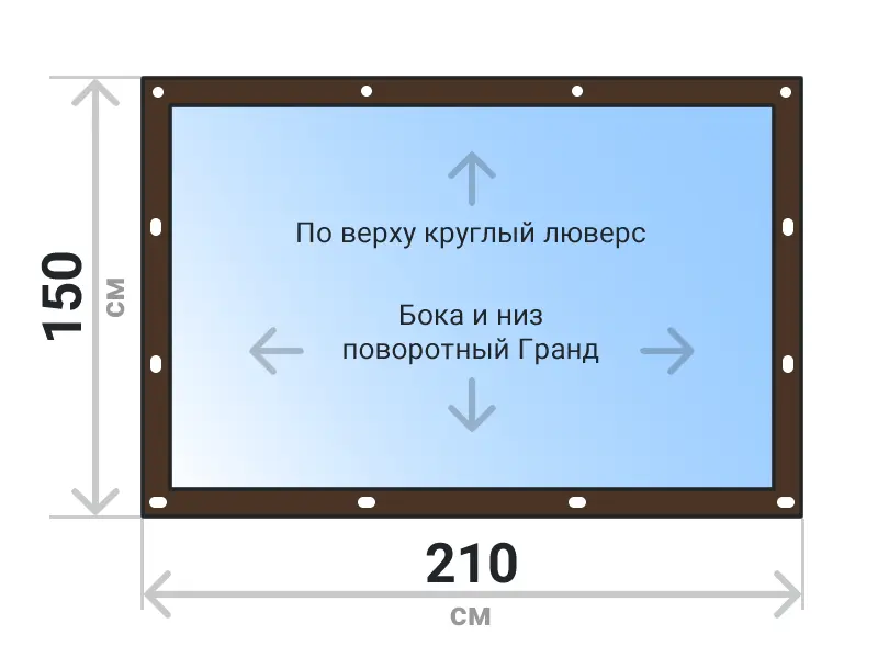 Мягкое окно съемное из прозрачной ПВХ пленки 700 микрон на поворотных скобах Гранд Лок по бокам и низу. По верхнему краю круглый люверс. Расстояние между креплениями 30-40 см. Полностью готовый к установке комплект, включая саморезы и ремни для скрутки.