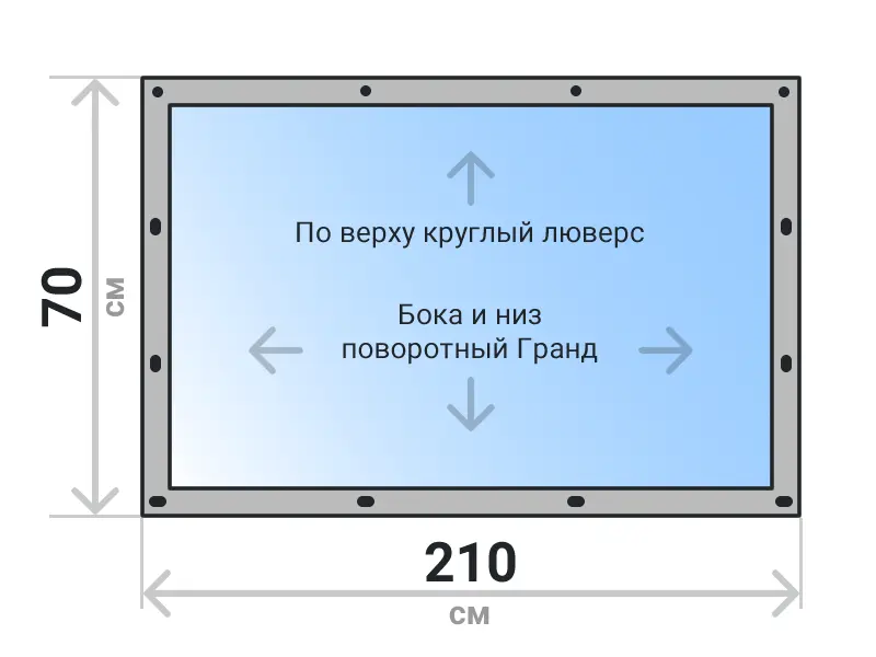 Мягкое окно съемное из прозрачной ПВХ пленки 700 микрон на поворотных скобах Гранд Лок по бокам и низу. По верхнему краю круглый люверс. Расстояние между креплениями 30-40 см. Полностью готовый к установке комплект, включая саморезы и ремни для скрутки.