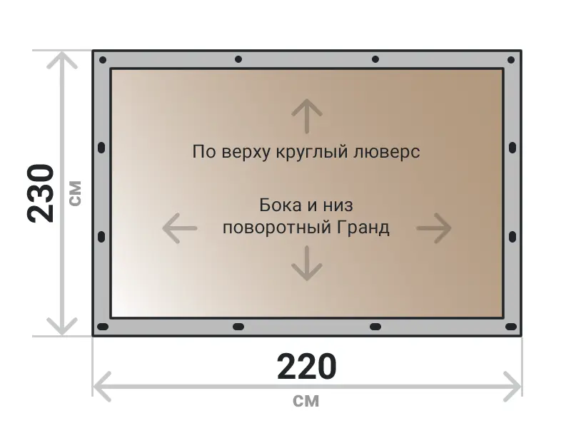 Мягкое окно съемное из тонированной ПВХ пленки 700 микрон на поворотных скобах Гранд Лок по бокам и низу. По верхнему краю круглый люверс. Расстояние между креплениями 30-40 см. Полностью готовый к установке комплект, включая саморезы и ремни для скрутки.