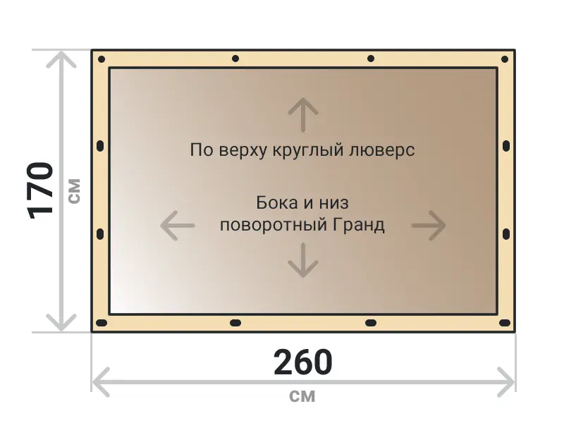 Мягкое окно съемное из тонированной ПВХ пленки 700 микрон на поворотных скобах Гранд Лок по бокам и низу. По верхнему краю круглый люверс. Расстояние между креплениями 30-40 см. Полностью готовый к установке комплект, включая саморезы и ремни для скрутки.