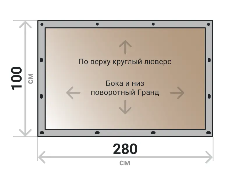 Мягкое окно съемное из тонированной ПВХ пленки 700 микрон на поворотных скобах Гранд Лок по бокам и низу. По верхнему краю круглый люверс. Расстояние между креплениями 30-40 см. Полностью готовый к установке комплект, включая саморезы и ремни для скрутки.