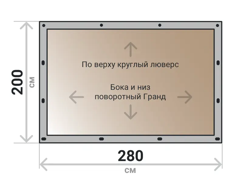 Мягкое окно съемное из тонированной ПВХ пленки 700 микрон на поворотных скобах Гранд Лок по бокам и низу. По верхнему краю круглый люверс. Расстояние между креплениями 30-40 см. Полностью готовый к установке комплект, включая саморезы и ремни для скрутки.
