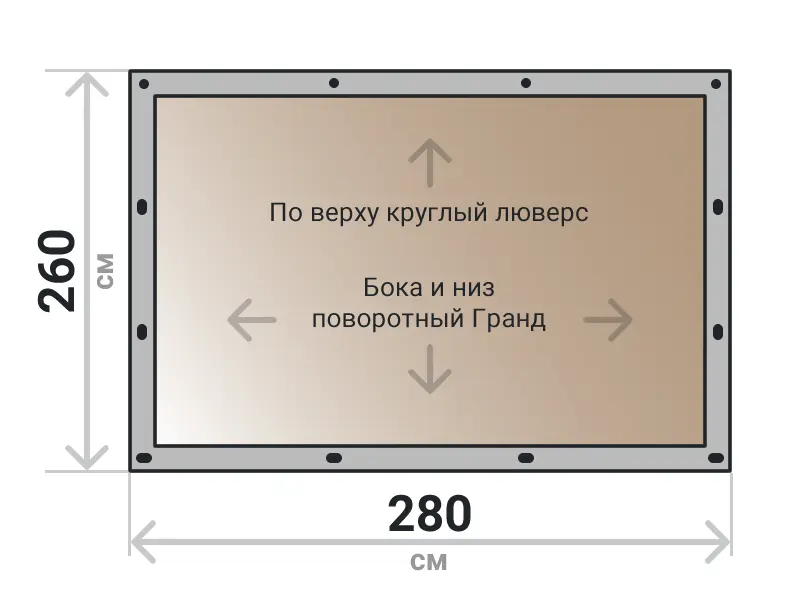 Мягкое окно съемное из тонированной ПВХ пленки 700 микрон на поворотных скобах Гранд Лок по бокам и низу. По верхнему краю круглый люверс. Расстояние между креплениями 30-40 см. Полностью готовый к установке комплект, включая саморезы и ремни для скрутки.