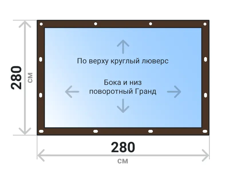 Мягкое окно съемное из прозрачной ПВХ пленки 700 микрон на поворотных скобах Гранд Лок по бокам и низу. По верхнему краю круглый люверс. Расстояние между креплениями 30-40 см. Полностью готовый к установке комплект, включая саморезы и ремни для скрутки.