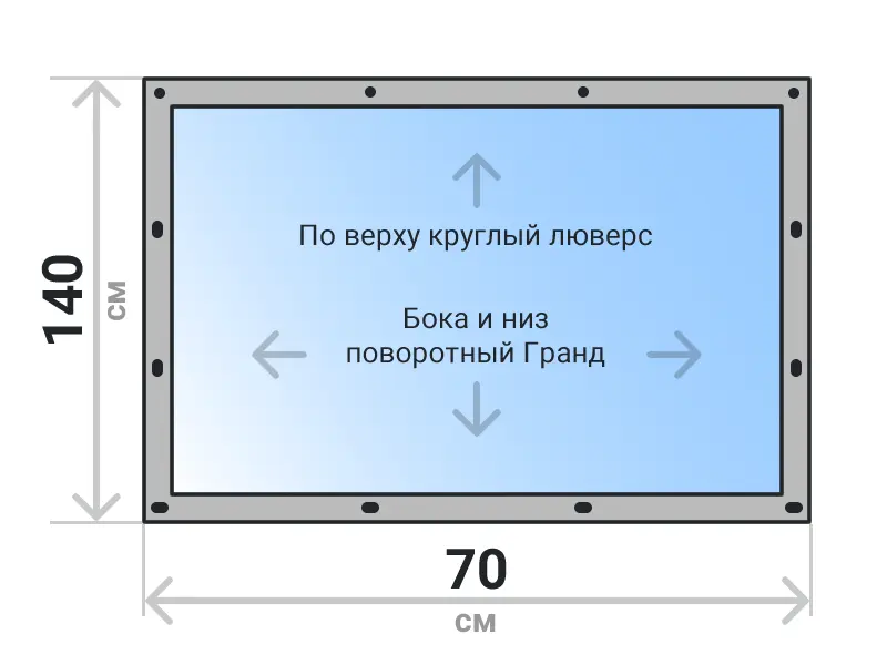 Мягкое окно съемное из прозрачной ПВХ пленки 700 микрон на поворотных скобах Гранд Лок по бокам и низу. По верхнему краю круглый люверс. Расстояние между креплениями 30-40 см. Полностью готовый к установке комплект, включая саморезы и ремни для скрутки.