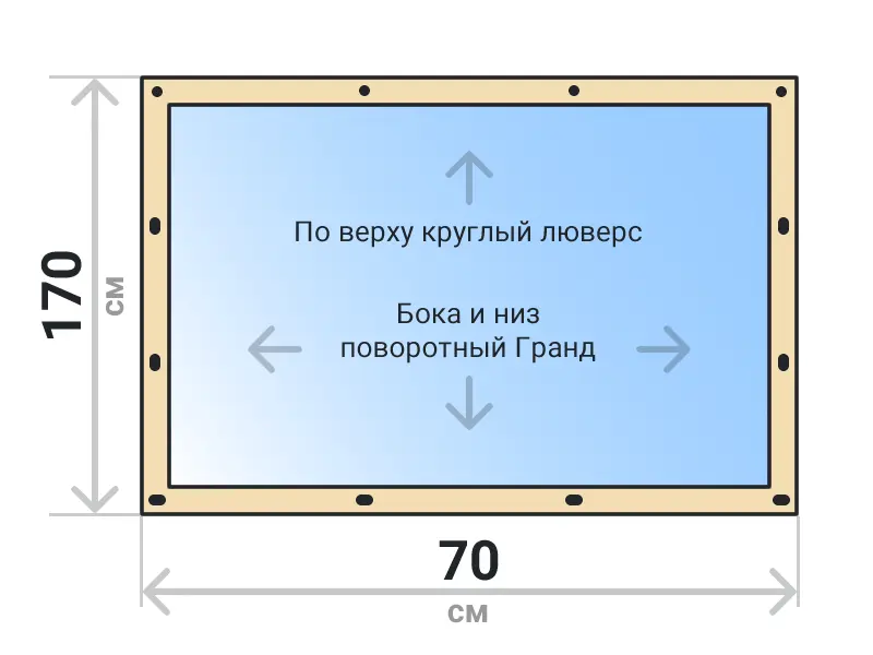 Мягкое окно съемное из прозрачной ПВХ пленки 700 микрон на поворотных скобах Гранд Лок по бокам и низу. По верхнему краю круглый люверс. Расстояние между креплениями 30-40 см. Полностью готовый к установке комплект, включая саморезы и ремни для скрутки.