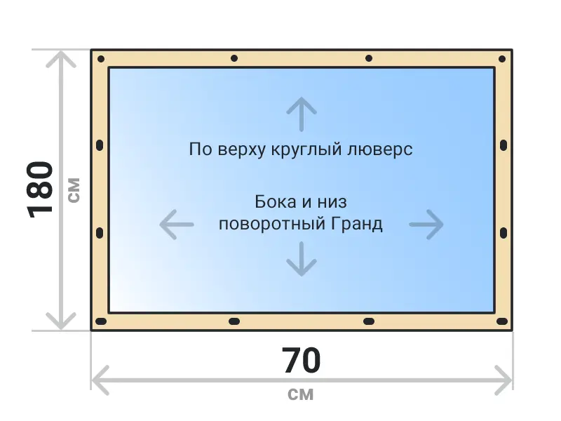 Мягкое окно съемное из прозрачной ПВХ пленки 700 микрон на поворотных скобах Гранд Лок по бокам и низу. По верхнему краю круглый люверс. Расстояние между креплениями 30-40 см. Полностью готовый к установке комплект, включая саморезы и ремни для скрутки.