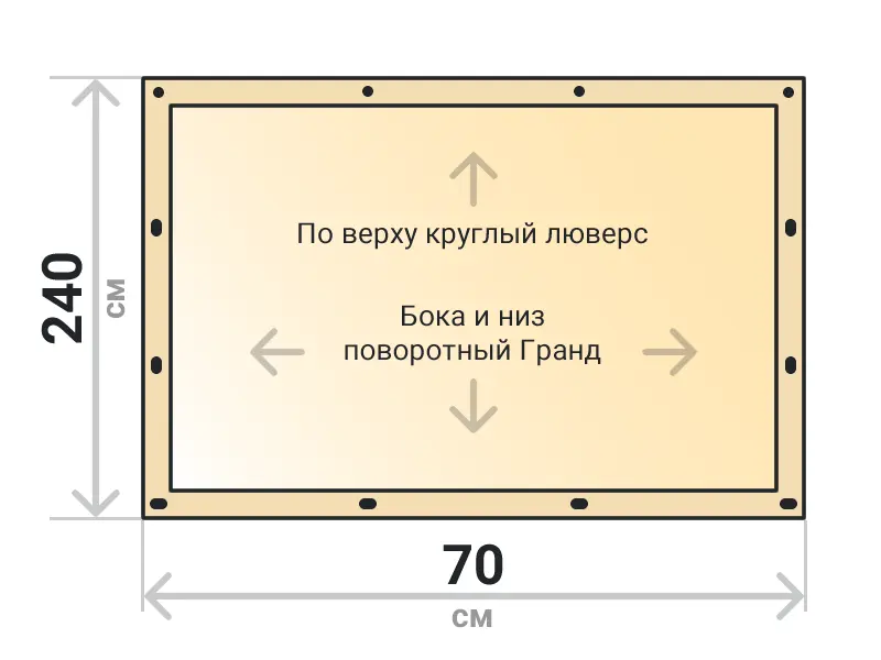Мягкое окно съемное из прозрачной ТПУ пленки 500 микрон на поворотных скобах Гранд Лок по бокам и низу. По верхнему краю круглый люверс. Расстояние между креплениями 30-40 см. Полностью готовый к установке комплект, включая саморезы и ремни для скрутки.