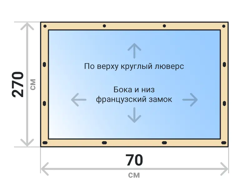 Мягкое окно съемное из прозрачной ПВХ пленки 700 микрон на французских замках по бокам и низу. По верхнему краю круглый люверс. Расстояние между креплениями 30-40 см. Полностью готовый к установке комплект, включая саморезы и ремни для скрутки.