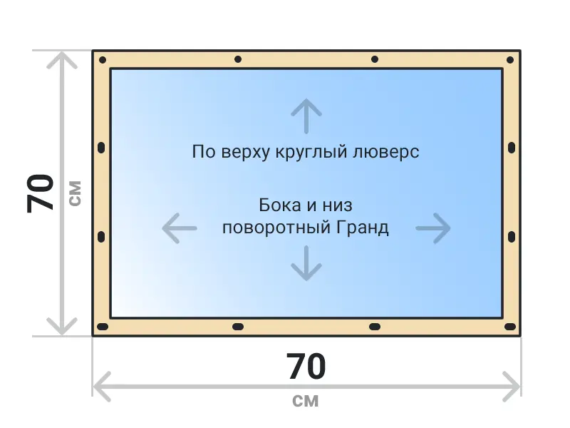 Мягкое окно съемное из прозрачной ПВХ пленки 700 микрон на поворотных скобах Гранд Лок по бокам и низу. По верхнему краю круглый люверс. Расстояние между креплениями 30-40 см. Полностью готовый к установке комплект, включая саморезы и ремни для скрутки.