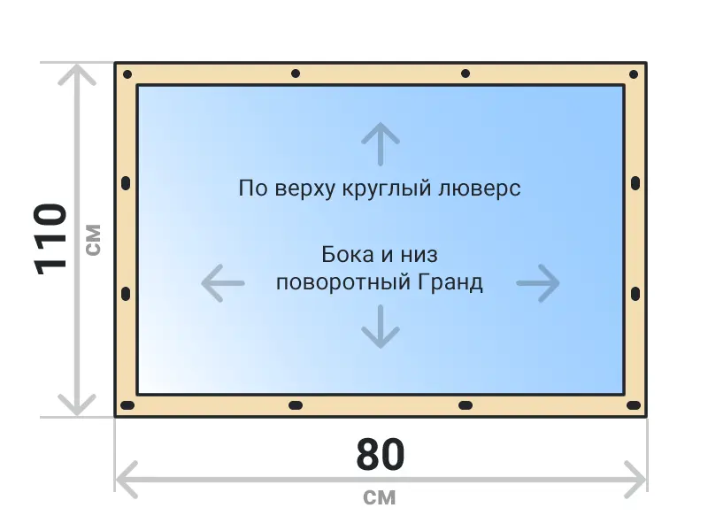 Мягкое окно съемное из прозрачной ПВХ пленки 700 микрон на поворотных скобах Гранд Лок по бокам и низу. По верхнему краю круглый люверс. Расстояние между креплениями 30-40 см. Полностью готовый к установке комплект, включая саморезы и ремни для скрутки.