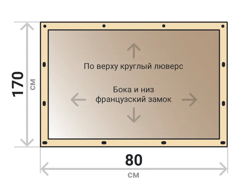 Мягкое окно съемное из тонированной ПВХ пленки 700 микрон на французских замках по бокам и низу. По верхнему краю круглый люверс. Расстояние между креплениями 30-40 см. Полностью готовый к установке комплект, включая саморезы и ремни для скрутки.