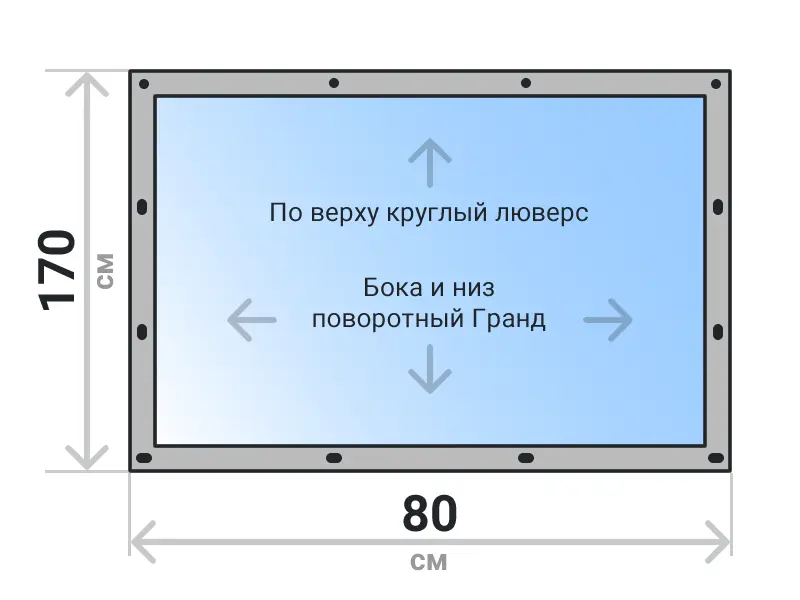 Мягкое окно съемное из прозрачной ПВХ пленки 700 микрон на поворотных скобах Гранд Лок по бокам и низу. По верхнему краю круглый люверс. Расстояние между креплениями 30-40 см. Полностью готовый к установке комплект, включая саморезы и ремни для скрутки.