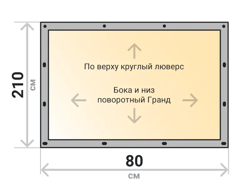 Мягкое окно съемное из прозрачной ТПУ пленки 500 микрон на поворотных скобах Гранд Лок по бокам и низу. По верхнему краю круглый люверс. Расстояние между креплениями 30-40 см. Полностью готовый к установке комплект, включая саморезы и ремни для скрутки.