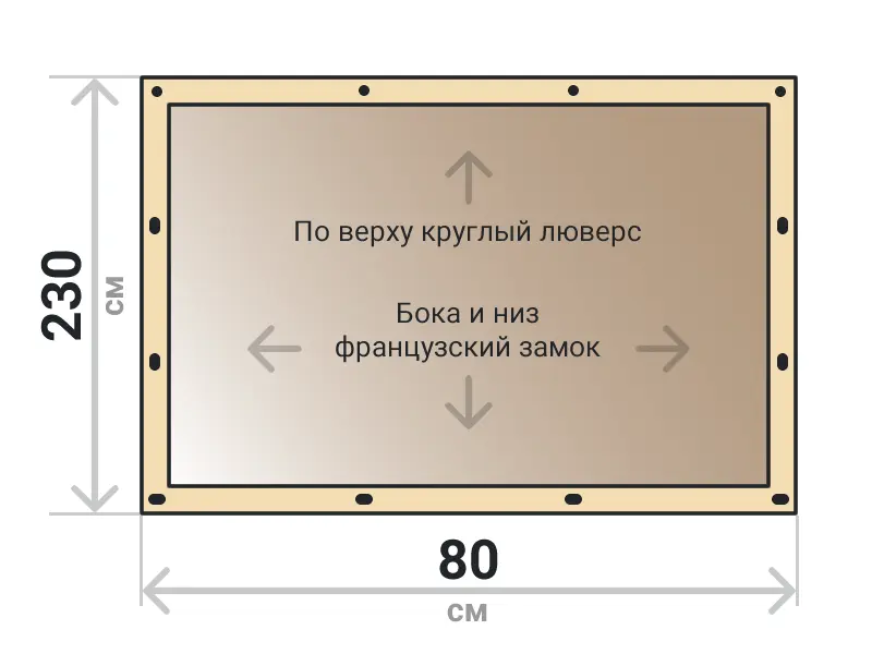 Мягкое окно съемное из тонированной ПВХ пленки 700 микрон на французских замках по бокам и низу. По верхнему краю круглый люверс. Расстояние между креплениями 30-40 см. Полностью готовый к установке комплект, включая саморезы и ремни для скрутки.
