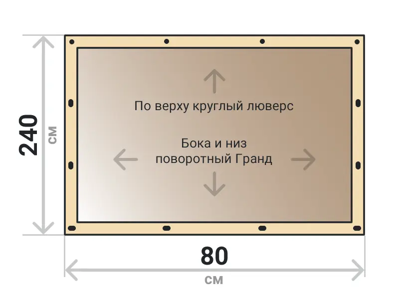 Мягкое окно съемное из тонированной ПВХ пленки 700 микрон на поворотных скобах Гранд Лок по бокам и низу. По верхнему краю круглый люверс. Расстояние между креплениями 30-40 см. Полностью готовый к установке комплект, включая саморезы и ремни для скрутки.