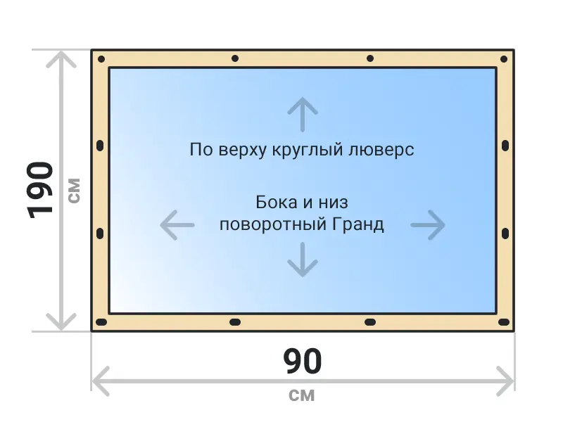 Мягкое окно съемное из прозрачной ПВХ пленки 700 микрон на поворотных скобах Гранд Лок по бокам и низу. По верхнему краю круглый люверс. Расстояние между креплениями 30-40 см. Полностью готовый к установке комплект, включая саморезы и ремни для скрутки.