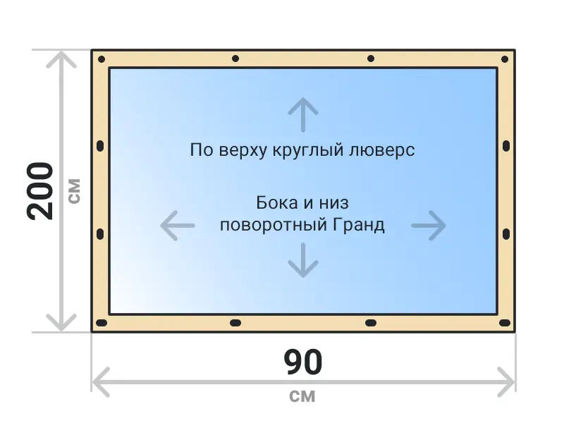 Мягкое окно съемное из прозрачной ПВХ пленки 700 микрон на поворотных скобах Гранд Лок по бокам и низу. По верхнему краю круглый люверс. Расстояние между креплениями 30-40 см. Полностью готовый к установке комплект, включая саморезы и ремни для скрутки.