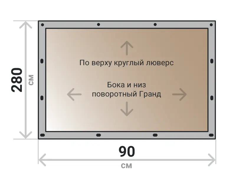 Мягкое окно съемное из тонированной ПВХ пленки 700 микрон на поворотных скобах Гранд Лок по бокам и низу. По верхнему краю круглый люверс. Расстояние между креплениями 30-40 см. Полностью готовый к установке комплект, включая саморезы и ремни для скрутки.